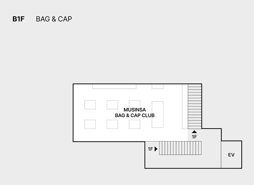 지하 1층부터 지상 3층에 이르는 압도적인 규모를 자랑하는 무신사 스토어 명동은 각 층마다 명확한 테마를 갖추고 있습니다. 그중에서도 특히 주목해야 할 공간은 거대한 규모로 조성된 '백 앤 캡 클럽'입니다.